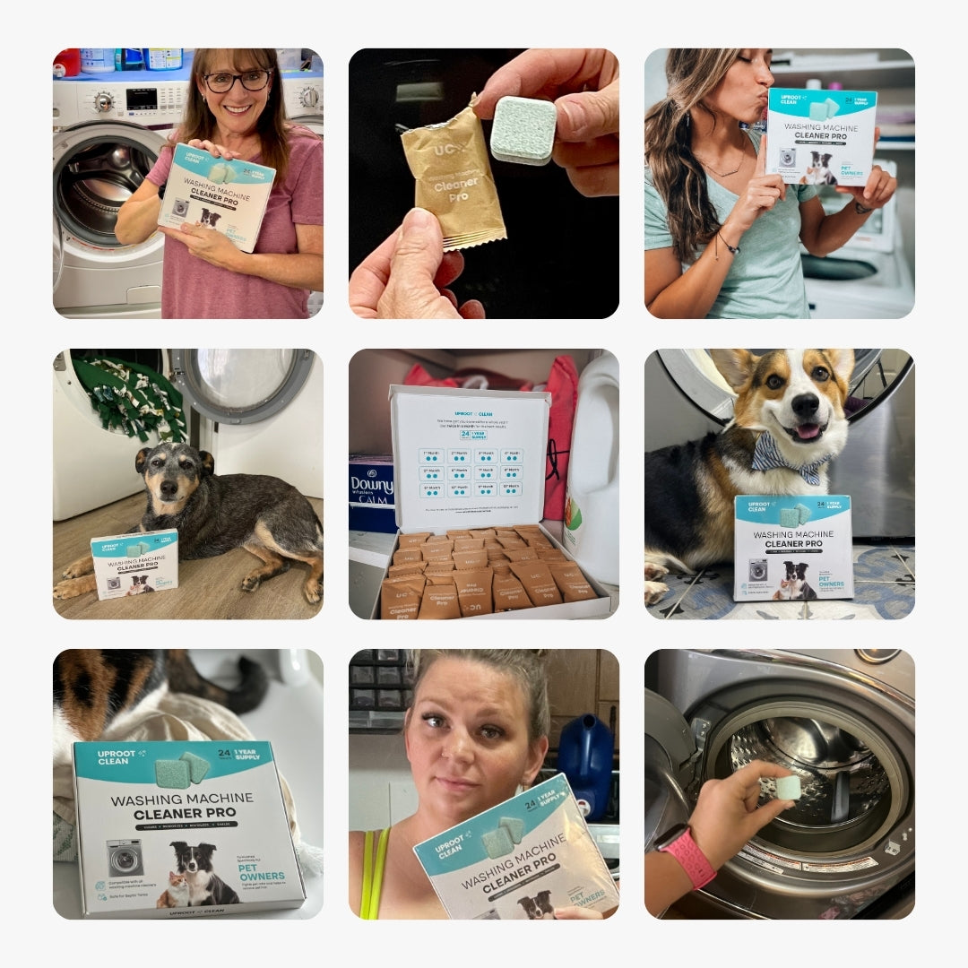 The Uproot Washing Machine Cleaner Pro is a tablet formulated specifically to clean washing machines that have pet hair, pet odor, detergent, softener and fabric residue in them. In addition, it kills 99.9% of leftover bacteria and germs in the machine post washing machine cycle.